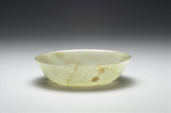 青白泛灰綠色玉,帶淺褐斑。琢一似淺碗的盤子,盤底為一實心圓片。或因結晶的單晶粒子較大,磨薄後好似全器布滿白斑。因長期使用,器身有數道沁為淺褐色的裂痕。