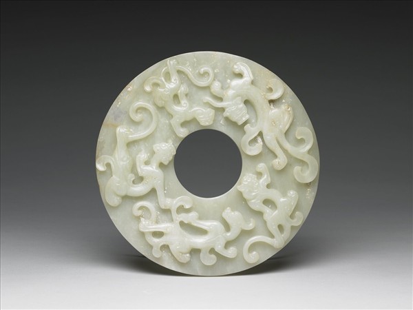 玉質,青白色。璧。一面雕五隻螭龍;另一面滿刻S形紋六圈。