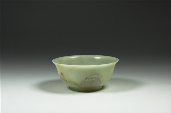 青玉,帶赭斑。侈口、深腹,有玉璺及裂痕,圈足。外底琢「大清乾隆年製」六字篆款。