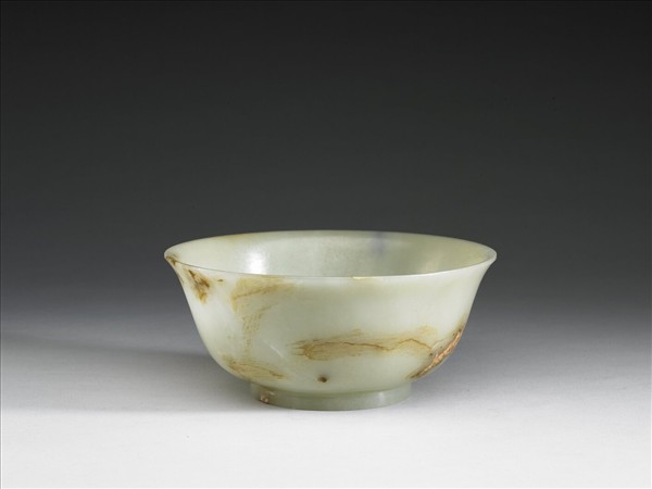 青玉,帶赭斑,有玉璺及裂痕。侈口、深腹、淺圈足。外底琢「大清乾隆年製」六字篆款。