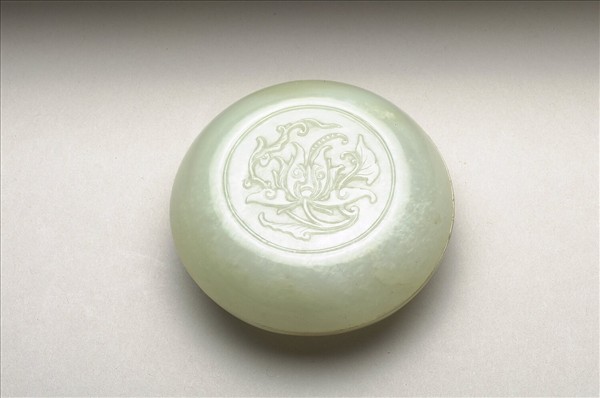 青玉質,有灰白斑。子母口,圈足。蓋面飾番蓮紋。圓盒為香具,收納香品,與香爐、香瓶三件一組。