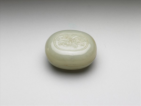 青玉質,有灰白及褐色斑。橢圓形盒,子母口,圈足,器略厚。蓋面飾折枝花葉紋。盒為香具,收納香品,與香爐、香瓶三件一組。