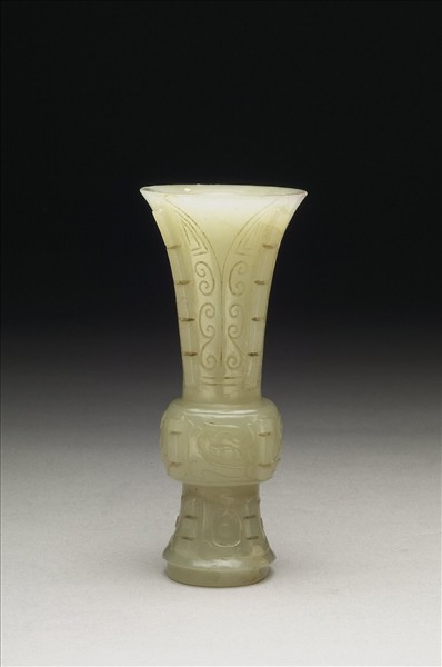 玉質。瓶仿觚形,有扉棱四道。器分三段裝飾,上段頸部為蕉葉紋,中段飾獸面。瓶為香具,用來插置香箸及香鏟,與香爐、香盒三件一組。