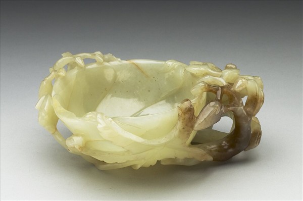 玉質,青玉泛灰黃,局部呈棕色。洗,器作盛開花形,內壁中央浮雕花心,外壁浮雕、鏤雕大小花苞及枝葉,葉分五歧,三片大葉捲附在口沿,頗為生動。