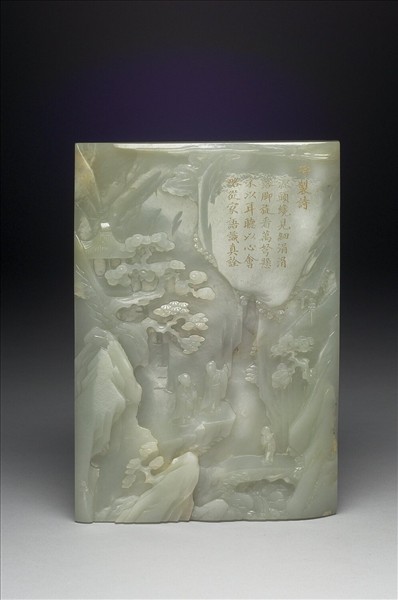 青玉質。雙面多層浮雕山水人物─一面,兩文士相對閒談,岩面陰刻填金楷書乾隆觀景詩一首:「御製詩 源頭纔見細涓涓,落腳旋看萬弩懸。不以耳聽以心會,略從家語識真詮。」詩錄於《清高宗御製詩文全集‧御製詩三集》卷六十七頁二十二,〈觀瀑〉丁亥(乾隆三十二年,1767)。另面一高士拄杖徐行,手持靈芝。童子跟隨在後,肩搭一枝佛手。