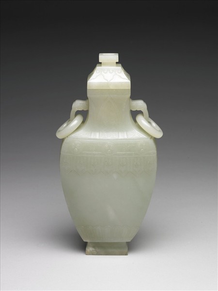 青玉局部泛淺灰綠,有白綹。扁方瓶,短頸,寬肩,長弧腹歛下,方足,雙獸耳帶活環,玉鈕蓋。頸陰線刻蕉葉紋,腹琢飾渦冏紋、變形蓮瓣等紋飾,蓋有如意雲紋、回紋。底刻「乾隆年製」四字隸款。