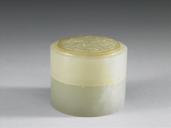 灰白色,圓筒形盒,無圈足,器壁略厚。蓋面浮雕平展蓮花。