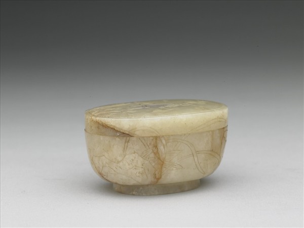青玉,灰黃色,橢圓形盒,表面多赭斑。器略厚,有圈足。蓋面陰線刻梅花及枝葉,盒壁陰線刻山石、水仙花紋。