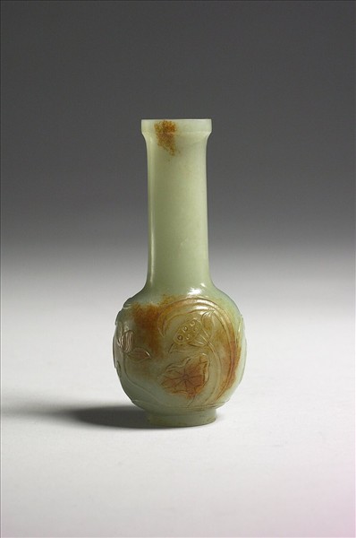 玉質,青綠色,帶大片黃赭斑。長頸,圓腹,有圈足。腹飾荷花、蓮子、水草、水波紋。口沿及腹部的赭斑,點綴全器,典雅有趣。