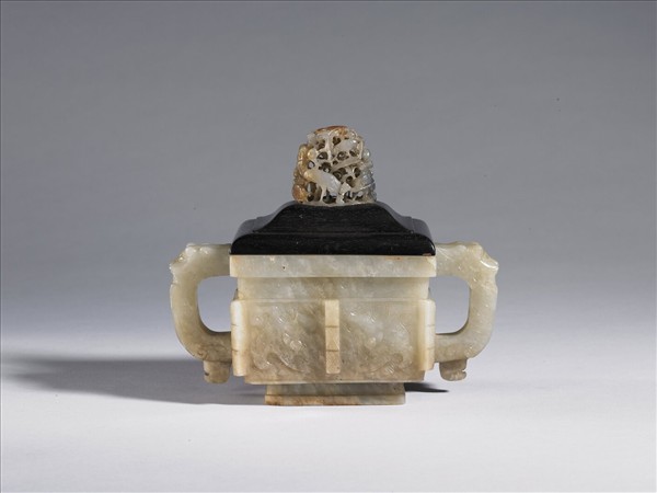 青玉,灰黃色,長方形爐,表面有赭黃斑。附木蓋玉頂,有圈足。雙耳琢獸首,下帶垂珥,頸淺浮雕夔紋,腹飾簡化獸面紋,飾以回紋緣,有六條棱脊。玉頂搭配玉色之變化立雕鶴與鹿,生動活潑,玉頂年代為元至明初。