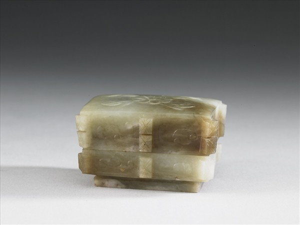 青玉,長方形盒,有圈足。蓋面淺浮雕八瓣花紋,盒壁飾卷雲紋,有六條棱脊,其上飾菱格紋。