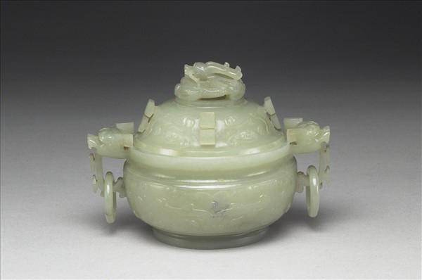 玉質,有瑕疵。爐,圓口,鼓腹,雙獸耳,口啣活環,圈足,帶蓋。器腹及蓋面淺浮雕獸面為飾,蓋頂立雕一盤龍為鈕。爐為香具,與香瓶、香盒三件一組。