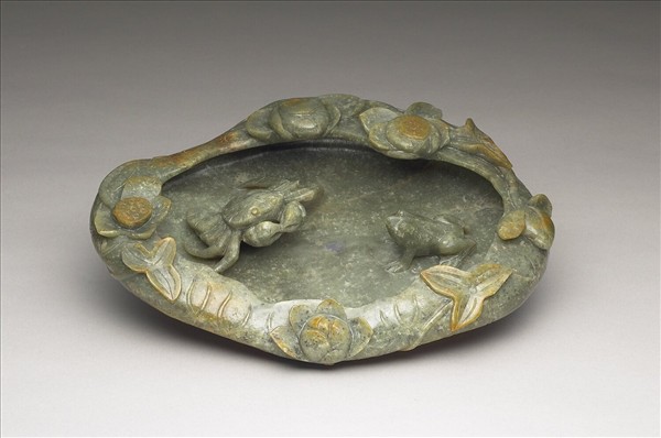 碧玉,帶灰白斑點,有褐黃玉皮或烤色。全器雕是一片捲曲荷葉,略呈橢圓形,中央凹處可以盛水。內浮雕蛙蟹各一,沿面上雕琢蓮花、慈菇、蓮苞等。器底雕飾荷葉莖脈紋絡。