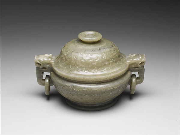 灰玉,有黑色斑點。爐圓口,雙龍耳,下接活環,圈足,帶蓋。為香具,與香瓶、香盒三件一組。腹及蓋面皆淺浮雕獸面紋。