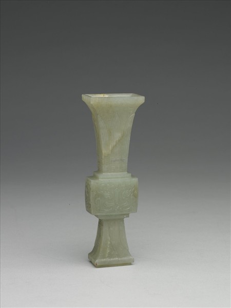 青玉仿觚形扁瓶。方形器,全器橫截面呈長方形。全器分三段,上下兩段飾蕉葉紋,並以雷紋為地,中段則為獸面紋。