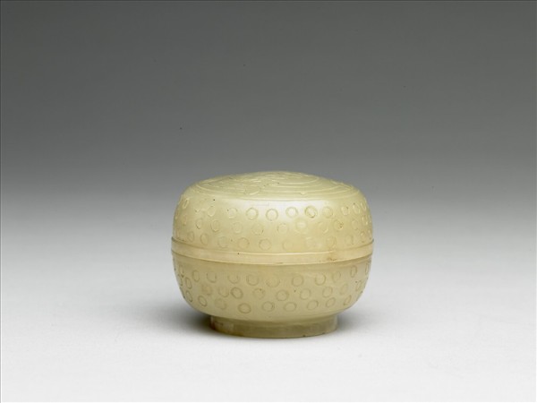 青玉小圓盒,玉色泛黃。蓋與器身略相等,弧形壁,有圈足。蓋面飾夔龍紋,蓋沿與壁滿布乳丁紋。