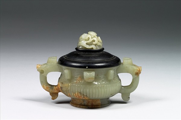 玉簋形爐,有大片赭沁及璺。二耳作立雕獸首形,有圈足。口沿下有立雕小獸首,頸部飾「壽」字及棱脊,腹部則為直棱紋。附木蓋玉頂,玉頂年代為元代。