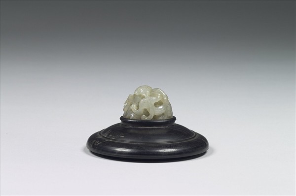 附件 木蓋玉頂,白色玉質,整體呈半球形,立雕作一小螭盤於頂上。