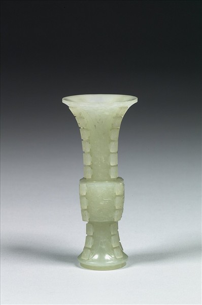 青玉質。全器分三截仿銅觚造形,四角有棱脊。上下兩段陰刻蕉葉紋,中段淺雕獸面紋。