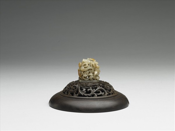 附件 木蓋玉頂,青玉泛黃,以多層次鏤雕蓮塘景致,有龍穿梭於荷花荷葉之中。木蓋以鏤空飾番蓮與卷草。