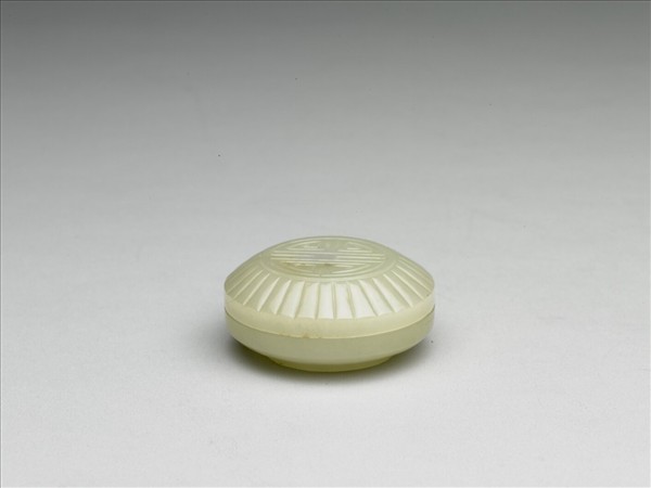 青玉小圓盒,玉色偏白。蓋與器身略相等,蓋與腹有折沿,圈足。蓋面飾一團「壽」字,蓋沿作放射狀的直條紋。