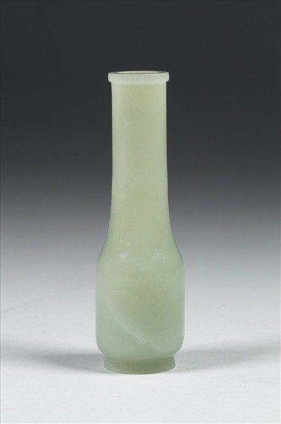 青玉小瓶,色青有綹。長頸、直筒腹,有圈足。口有凸沿一圈,全器光素無紋。