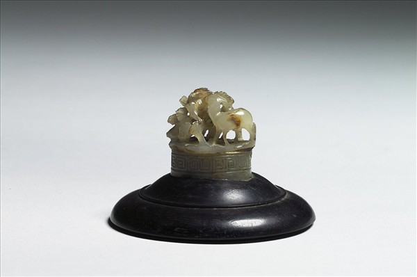 附件 木蓋玉頂,青玉泛黃,玉質有璺。玉頂有座,飾一周回紋,此座應為清代後加,玉頂本身作秋山紋飾:鏤雕雙鹿與闊葉樹。
