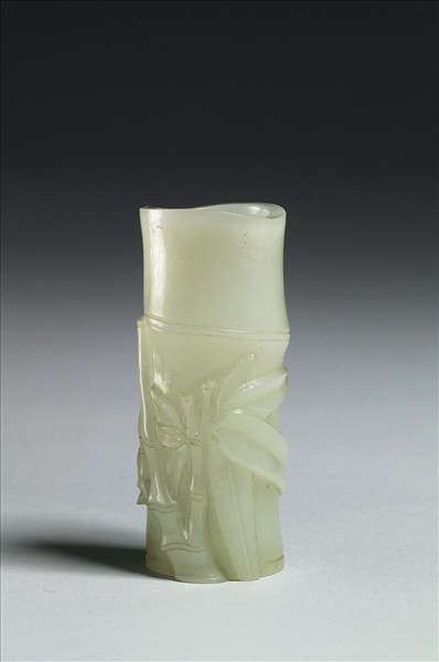 青玉竹節形瓶。全器為圓柱形,作竹節狀,其上並以淺浮雕飾竹枝與葉。