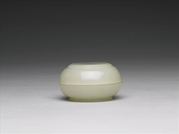 青玉。圓盒,子母口,圈足。全器除蓋面雕飾二漸層弦紋外,光素無紋。盒為收納香品用器,與香爐、香瓶三件一組。