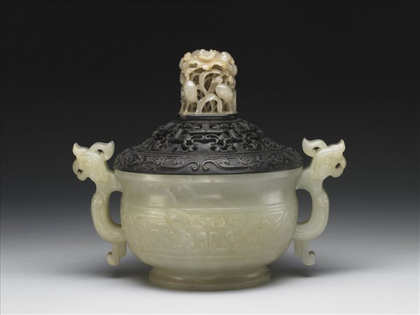 青玉,有白斑。圓形爐,圈足,雙耳。腹淺浮雕獸面紋,雙耳雕鳥首。附鏤雕蓮塘鴛鴦紋玉頂黑檀木蓋,玉頂年代為元代。爐為香具,與香瓶、香盒三件一組。