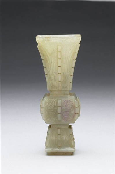 青玉。瓶仿古銅方觚形,方足。作為香具,用來插置香箸及香鏟,與香爐、香盒三件一組。全器分上、中、下三段,每段各飾出扉棱八道,上下段琢飾蕉葉紋,中段器腹則為淺浮雕獸面紋。附青玉香鏟、香箸各一。
