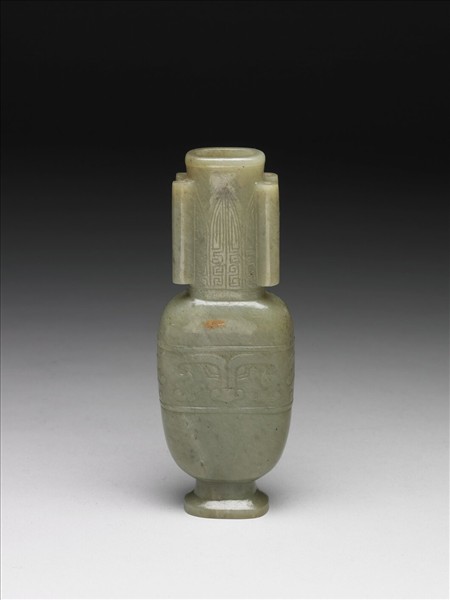青玉。長方扁瓶,四貫耳。頸陰線刻蕉葉紋,腹琢飾獸面紋。瓶為香具,用來插置香箸及香鏟,與香爐、香盒三件一組。