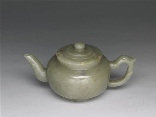 青玉,帶褐色瑕斑。器腹雕飾詩文一圈。底有「子剛」篆款。