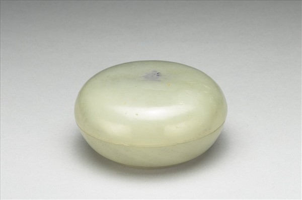 玉質。圓盒,子母口,圈足。全器光素無紋。為香具,收納香品,與香爐、香瓶三件一組。