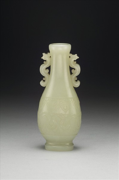 玉質,玉質瑩潤。瓶,唇口,雙鳳耳,圈足。雙耳鏤雕作鳳鳥;腹作減地浮雕變形如意雲紋及雲紋二圈。為香具,用來插置香箸及香鏟,與香爐、香盒三件一組。