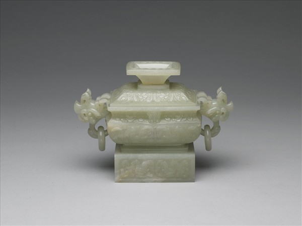 玉質,略帶灰白瑕斑紋。方形爐,器仿青銅簋造型。器腹、方座及器蓋面均飾浮雕鳥紋,以回紋為地。雙耳作鏤雕立鳥。器蓋則為喇叭長方形口,中空,以交索紋及回紋為飾。為香具,與香瓶、香盒三件一組。