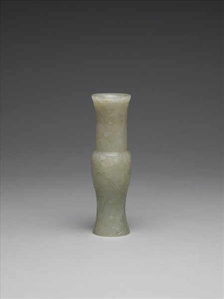 玉質,有瑕斑。瓶,侈口,器身分作兩段,上段雕飾靈芝花卉,下段則琢梅花、竹葉,寓言如意平安。瓶為香具,用來插置香箸及香鏟,與香爐、香盒三件一組。