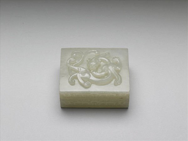 玉質。方盒,子母口,淺壁。蓋、盒側面琢飾變形獸面紋,以回紋為地;蓋面則浮雕螭龍一隻,姿態頗生動。為香具,收納香品,與香爐、香瓶三件一組。