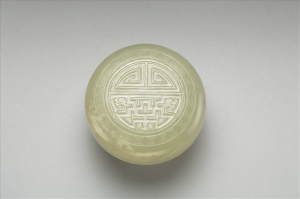 玉質,帶黃及灰黑瑕斑。扁圓盒,圈足。蓋面琢一團「壽」字及回紋一圈。為香具,收納香品,與香爐、香瓶三件一組。