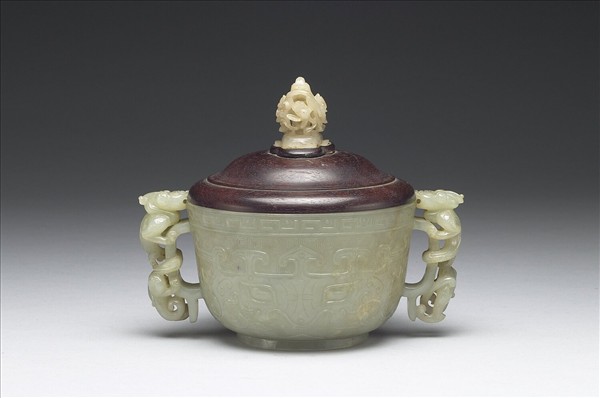 玉質,帶褐黃瑕斑。腹壁圓直,圈足,雙龍耳。器腹浮雕獸面紋,足底陰線刻回首龍紋。附鏤雕荷花鴛鴦玉頂紫檀木蓋。為香具,與香瓶、香盒三件一組。
