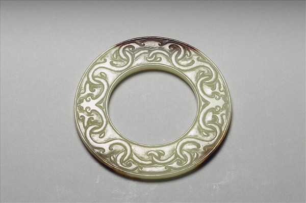 玉質,色青白而有赭斑。為一大孔玉璧,亦可稱為「瑗」。一面淺浮雕龍紋兩隻牽連圈圍器面為飾,另一面則陰線刻螭龍六隻為飾。器內外徑均有廓。附木架。