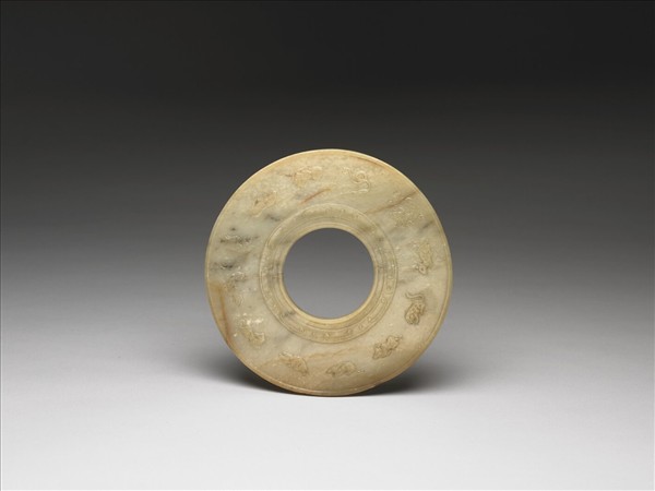 玉質,灰白色。外徑有廓,內徑廓雕飾弦紋及雲紋一圈,器一面琢飾十二生肖圖像,另一面則琢八卦,及天干篆字。附木架。
