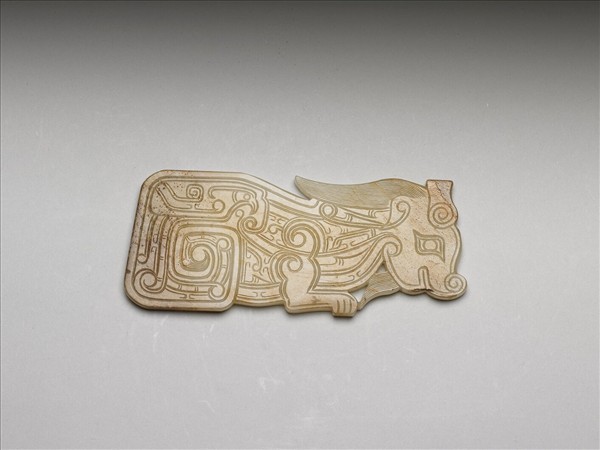 玉質,黃白色,做夔形,頭上有角及鬚,單足,捲尾。身上飾雲紋,臀尾部飾鳳鳥紋。紫檀嵌玉圓盒 。