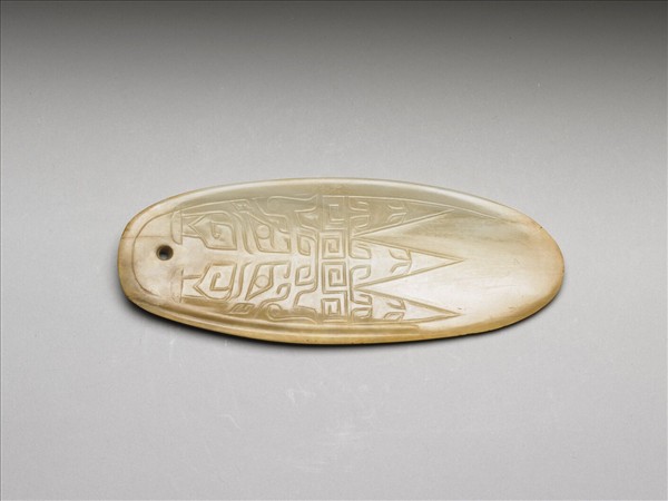 牙黃色玉質,似為用史前至商周古玉改製。器座長橢圓形,帶一穿。正面微凹,用凸弦紋雕琢仿商代至西周的動物面,以及回紋、變體蟬紋。背面微鼓凸,光素。
