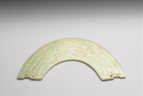 玉質,青白色,器面均以陰線刻變形雲氣紋為飾,器之兩端各有二穿,正可供佩飾時穿引綁縛之用。