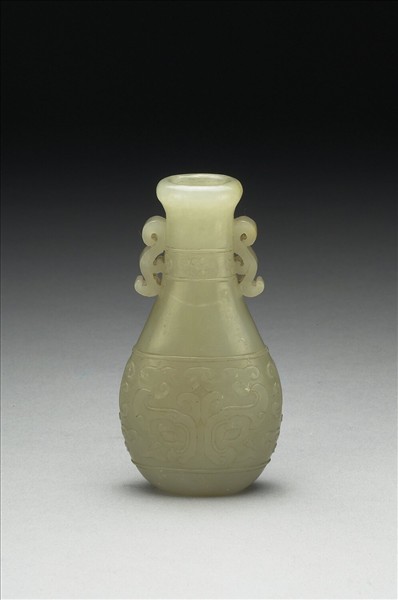 玉質,青白泛黃灰色。瓶,口作一圈圓唇,捲雲形鏤雕器耳。頸飾六瓣花紋;腹淺浮雕獸面紋,底內凹。為香具,用來插置香箸及香鏟,與香爐、香盒三件一組。
