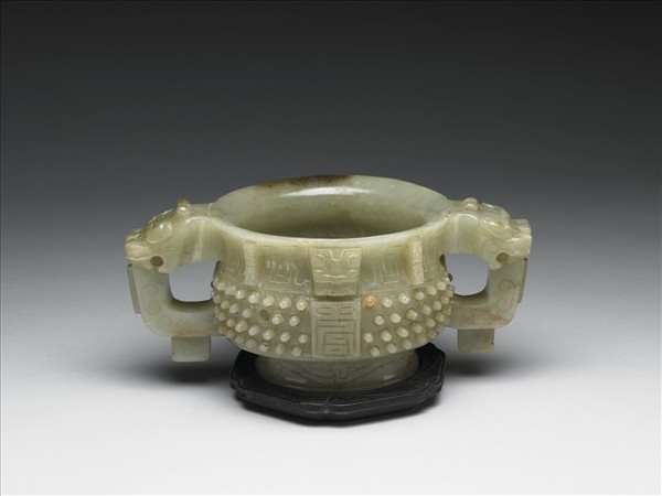 玉質,青灰泛綠色,局部帶赭斑。簋形爐,雙龍形環耳,下有垂珥。器腹飾高乳丁紋,乳丁是一粒粒圓柱嵌入凹槽而成,偶有乳丁遺失的情況。腹璧棱脊上為獸面、下為「壽」字。無蓋,配有木座。為香具,與香瓶、香盒三件一組。