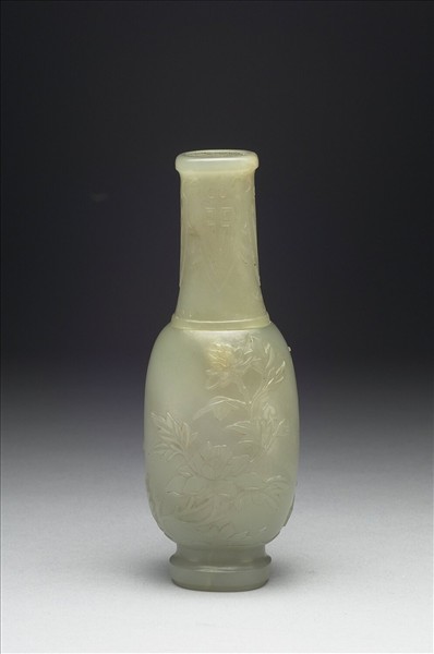 玉質,青白泛灰黃色玉。瓶,直頸,圓扁腹,高圈足。兩件式,頸部可取下。頸飾仿古蟬紋;腹璧淺浮雕牡丹,一面雕蝙蝠、菊花。為香具,用來插置香箸及香鏟,與香爐、香盒三件一組。