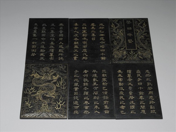 碧玉。冊頁,由六片長方形玉片組成。首頁和末頁雕刻泥金龍紋、壽山福海,題為「鑒昭游藝」,內刻續編秘殿珠林石渠寶笈之序文。由內文可知,此玉冊成於乾隆五十八年(癸丑),西元1793年。