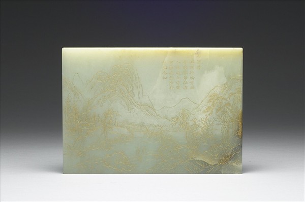 青玉質。單面線刻填金山水人物,二士人策杖緩行於溪橋之上。留白處陰刻填金隸書清高宗題畫詩一首:「御製詩 溫潤神情秀拔溪,溪橋策杖有人逢。底知夕照秋巒表,幾點丹楓間老松。」詩登錄於《清高宗御製詩文全集‧御製詩三集》卷二十五頁十一,〈題王蒙秋巒夕照〉壬午(乾隆二十七年,1762)。此屏與中玉170〈清 乾隆 竹林水閣插屏〉可配為一對。
